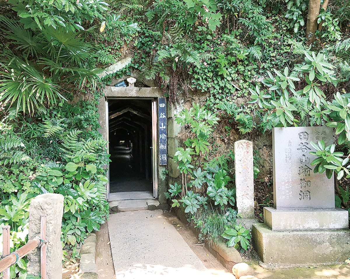 田谷の洞窟は「田谷山瑜伽洞(ゆがどう)」と呼ばれる人工の横穴洞窟で、真言宗大覚寺派「定泉寺」の敷地内にある。全長約570メートルの三層構造で、真言密教の修業の場とされていたという。壁面には浮彫のレリーフ約250点が配され、市の登録地域史跡にもなっている。