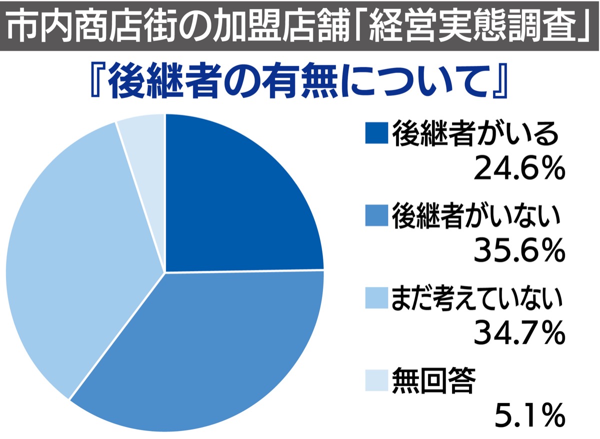 その結果、後継者の有無についての設問では「後継者がいない」が35・6%と最も高く、次いで「まだ考えていない」(34・7%)、「後継者がいる」(24・6%)となっており、全体の3分の1以上の個店で後継者不在という実情が浮き彫りとなった。