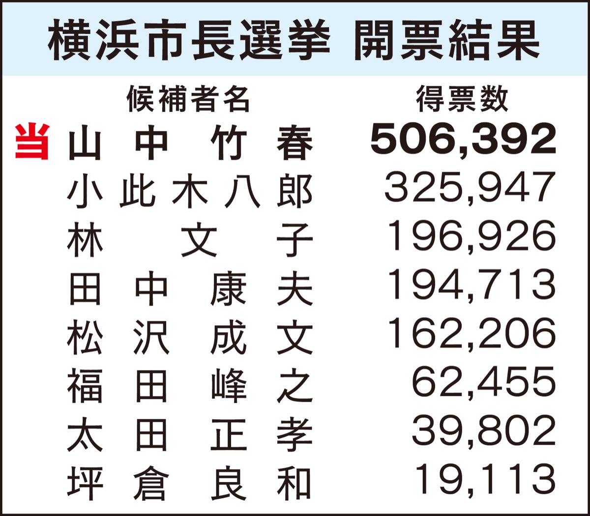 任期満了に伴う横浜市長選挙が8月22日に投開票され、無所属で新人の元横浜市大教授、山中竹春氏(48)=立憲民主党推薦=が約50万票を得て初当選した。過去最多の8人が立候補する中、自民党と公明党が中心に支援した小此木八郎氏(56)や4選を目指した現職の林文子氏(75)らを破り、12年ぶりの市長交代となった。山中氏は争点の一つだった統合型リゾート(IR)誘致に反対しており、市の方針が転換される。投票率は49・05%で前回を11・84ポイント上回った。