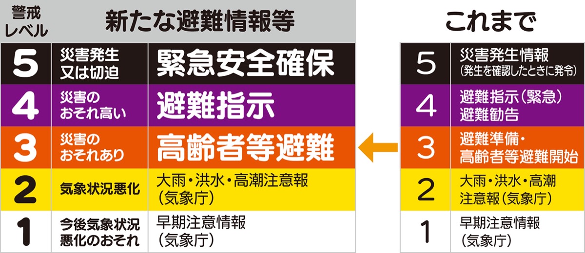 近年の風雨災害規模拡大を受けて災害対策基本法が改正され、災害発生の切迫度を5段階で示す大雨警戒レベルについて避難開始時期などがより明確にされた。従来「避難勧告」は「避難指示」と同じレベル4とし、勧告より緊急性が高い時に「指示」が発令されていた。指示発令まで待って逃げ遅れるケースを防ぐため、現在は「避難指示」に一本化されている。この変更に際して国は、レベル4までに危険な場所にいる人の全員避難を求めている。