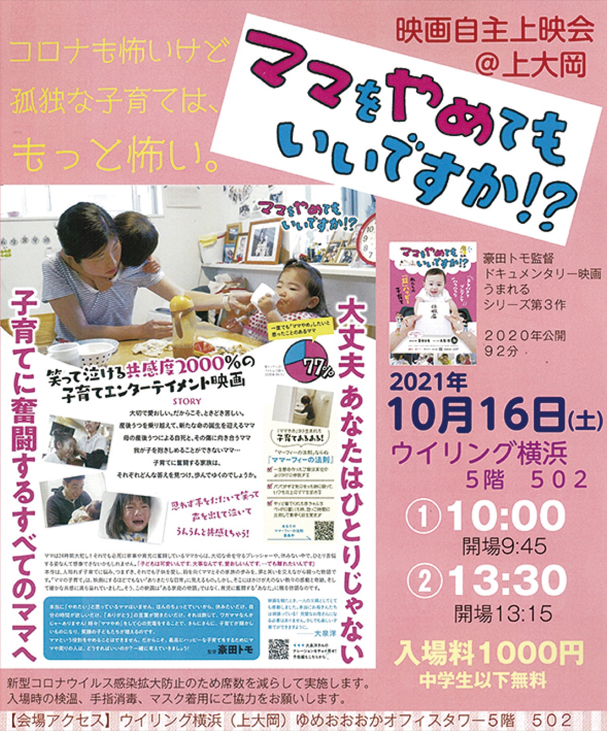 港南区在住主婦らが中心となり、産後うつなど子育て問題を扱った映画『ママをやめてもいいですか!?』の自主上映会を10月16日(土)、ウィリング横浜502(ゆめおおおかオフィスタワー5階)で開催する。