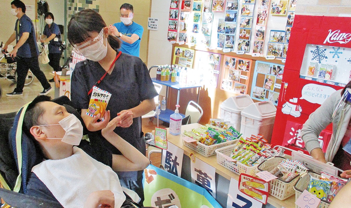 センター内ににぎやかな音楽が流れ、職員もはっぴを着るなどしてお祭りムードを盛り上げる中、施設利用者はゲームコーナーなどを楽しんだ=写真。男性職員は「皆さんとても楽しみにしていました。今日は表情がすごく素敵です」と笑顔を見せた。
