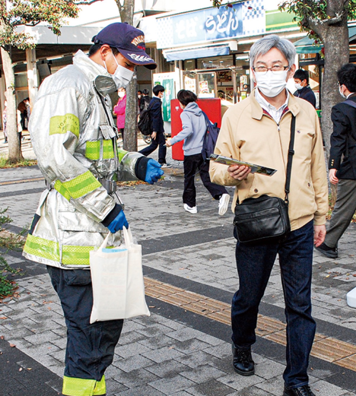 秋の全国火災予防運動期間中の10日、栄消防署はJR本郷台駅前広場で、住宅用火災警報器の設置・維持管理や防火対策の推進などを駅利用者らに訴えた=写真。