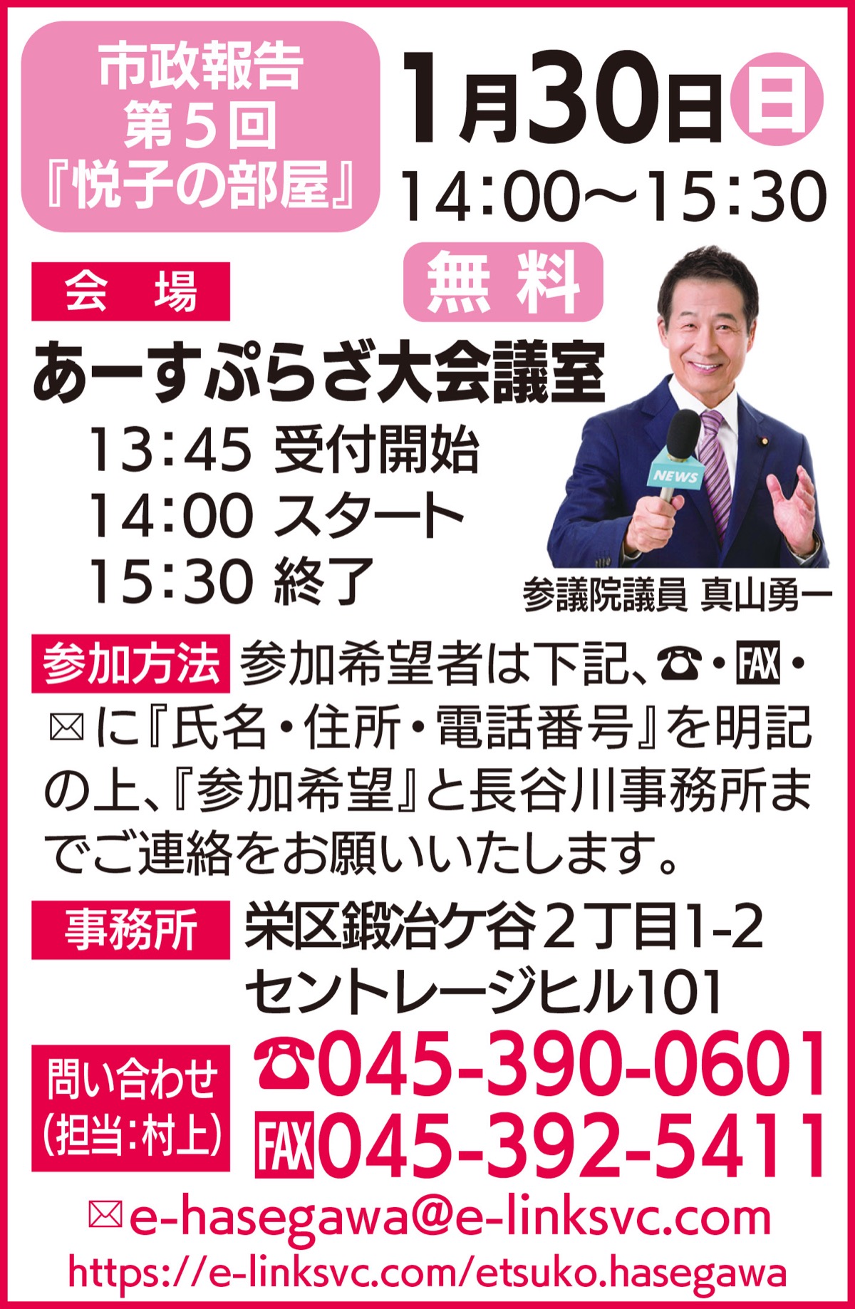今回の市政報告会、第5回「悦子の部屋」は参議院議員の真山勇一さんをお迎えし、横浜市が抱える少子高齢化の課題とともに、大多数の国民が選択的夫婦別姓の導入を求めている現実を把握した上で、多様性を認め合う社会を横浜市は、どう目指すかを語ります。