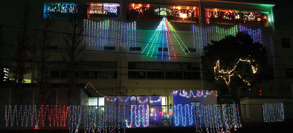 日野小学校で12月24日と25日の2日間、同小おやじの会のメンバーが中心となり「地域や子どもたちを明るくできれば」とイルミネーションを点灯させた。壁などが色とりどりに飾られ、近隣住民らの目を楽しませた。