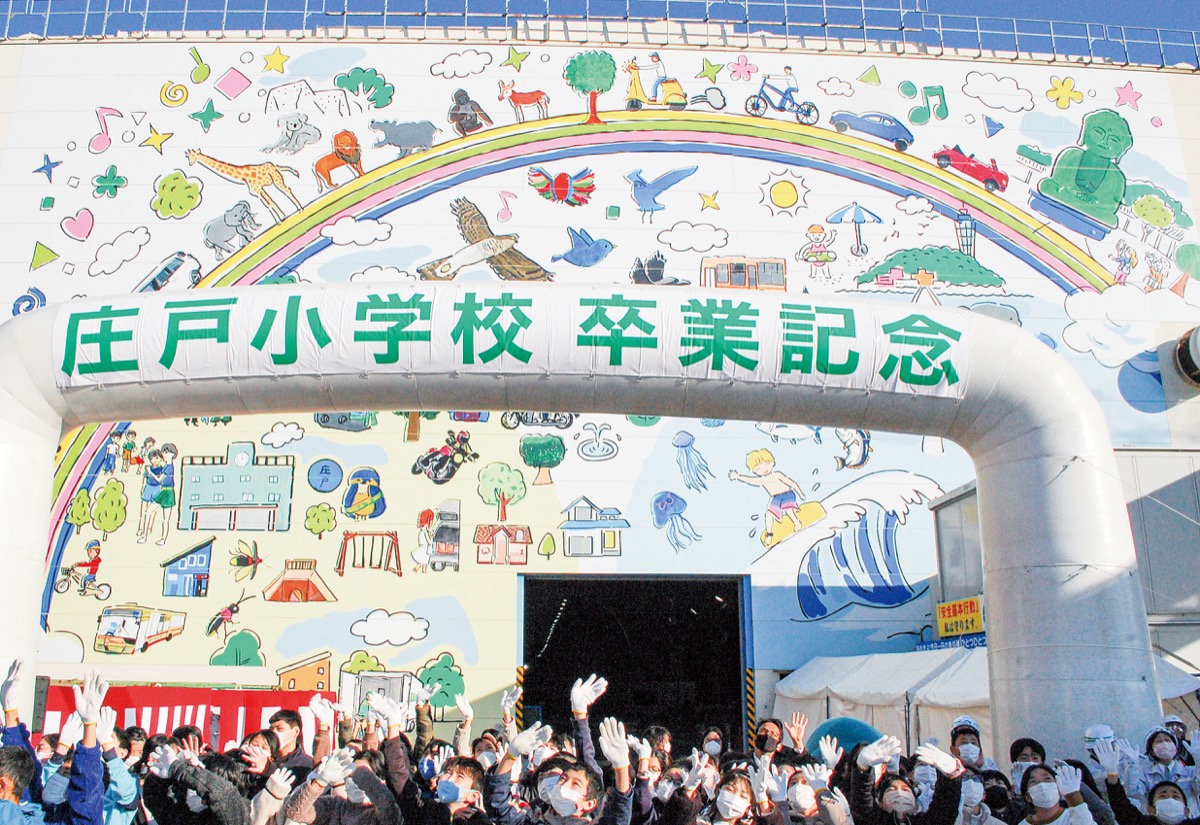金沢区と戸塚区を結ぶ「横浜環状南線」の庄戸トンネル防音ハウス(栄区上郷町)に、庄戸小6年生約60人が卒業記念として書いた絵をモチーフにした巨大壁画が登場した=写真。