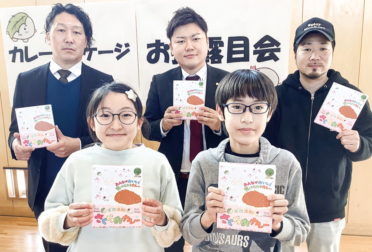 市立桜岡小学校(後藤俊哉校長)の5年生児童らが考案したレトルトカレー『笑顔満開!さくらおカレー』が完成し、8日に同小学校体育館で披露する会が開催された。初披露された商品に、児童は笑顔を見せた。