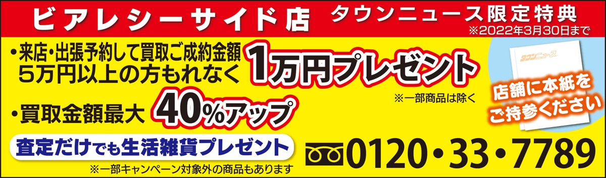 金沢区並木の商業施設「ビアレヨコハマ」本館1階にある買取専門店「おたからやビアレシーサイド店」は、お得なキャンぺーンを実施している。スタッフは「使わなくなった時計やアクセサリーなどはありませんか。査定だけでも構いませんので、気軽にご相談ください」と話す。