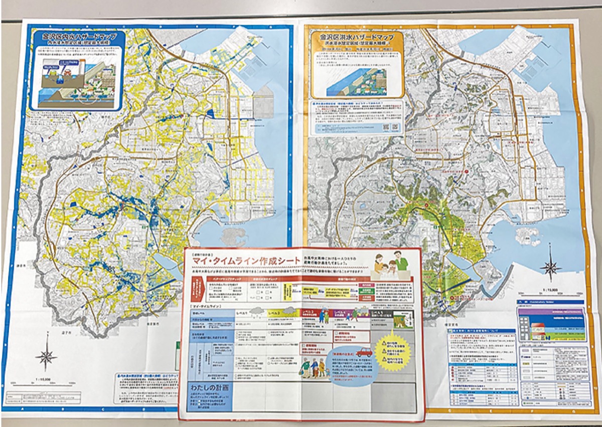 今回、全戸配布される浸水ハザードマップは、今まで個別に発行されていた洪水と内水、さらに県の高潮浸水想定区域図から高潮ハザードマップを作成し一冊にまとめたもの。台風や大雨などで想定される災害情報を集約することで、市民が利用しやすくする狙いだ。昨年、神奈川区と金沢区、栄区には先行配布されている。