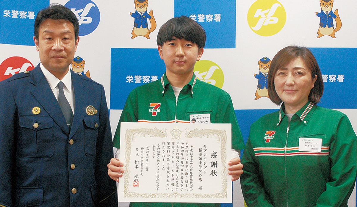 特殊詐欺の被害を未然に防いだとして栄警察署(松本光好署長)は4月25日、同署署長室でセブンイレブン横浜栄小菅ケ谷店の店員、今村太一さん(20・小菅ケ谷在住)に感謝状を贈呈した。