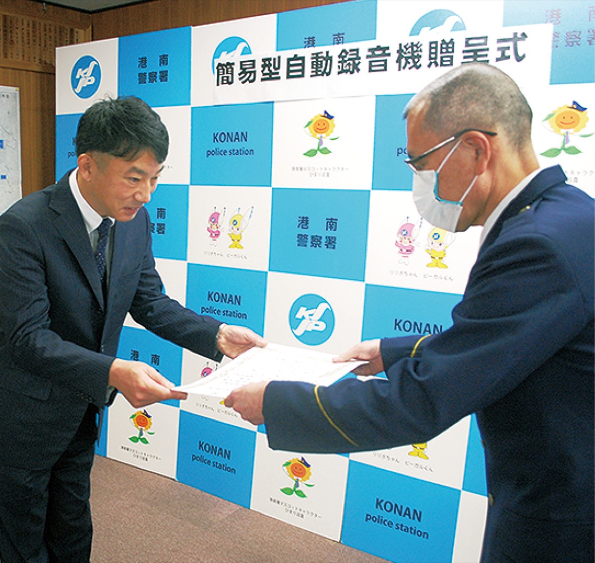 港南区内のパチンコ店など11店舗で構成された横浜遊技場組合港南支部(目黒秀幸支部長)は4月28日、港南警察署に対し、特殊詐欺対策の簡易型自動録音機「録音チュー」200台を寄贈した。また、寄贈を受けた港南署の菅野重和署長は目黒支部長へ感謝状を直接手渡した。