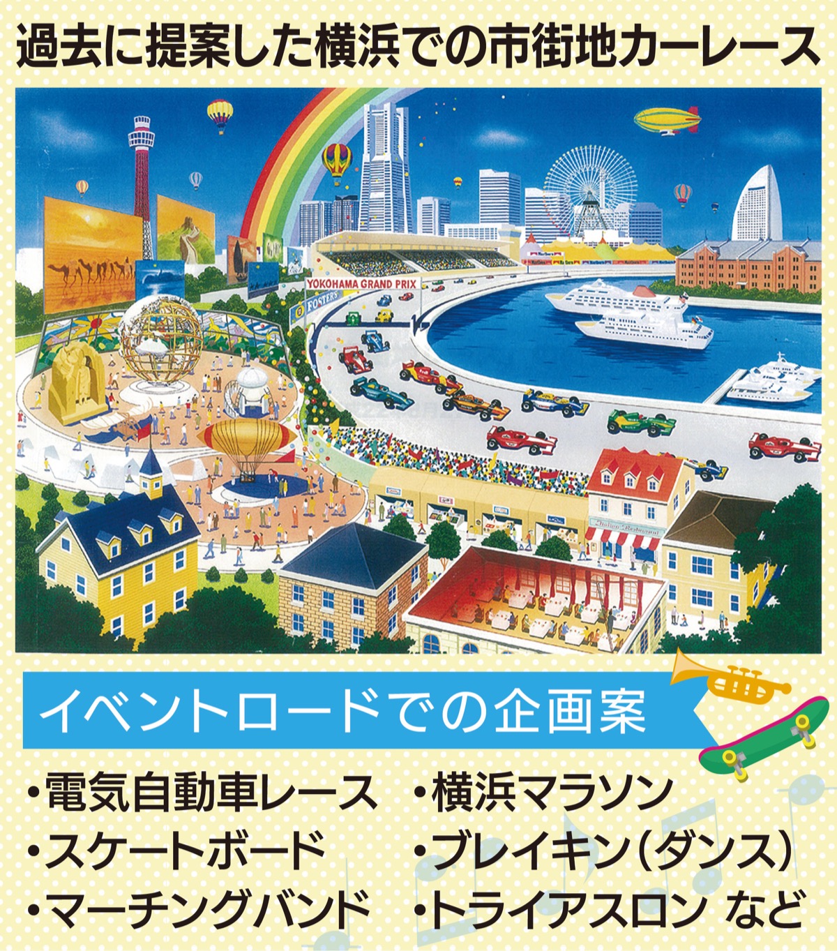 横浜では開港記念日の6月2日までを「横浜開港月間」として関内エリア等を中心に様々なイベントを実施しています。市では現在、内港地区や山下ふ頭の再開発に向けた意見を募集しており、私はそこで、ブラジル・リオのカーニバル会場のような観客席付きのイベントロード整備を提案していきたいと考えています。具体的には、脱炭素社会を見据えた電気自動車のF1「フォーミュラE」の誘致や五輪で注目を浴びたスケートボード、ダンス、マーチングバンドなど、老若男女が楽しめる企画を横浜から創出していきたいと思います。