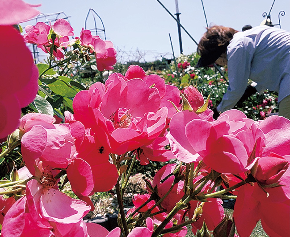 野七里第一公園前(栄区野七里一丁目)の「シャロンのばら園」でさまざまな品種のバラが開花を迎えている。