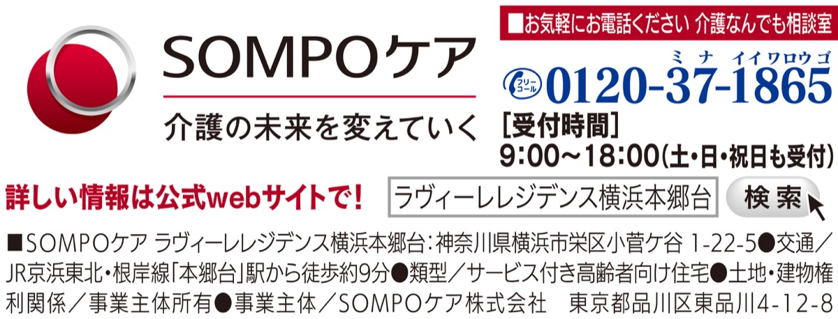 「SOMPOケアラヴィーレレジデンス横浜本郷台」は2022年4月、本郷台駅から徒歩約9分の立地にオープンした。60歳以上で自立の人から介護が必要な人も入居可能なホーム。24時間スタッフが常駐し、緊急時の対応や日々の相談などにも対応する。コンシェルジュを配置し、生活の相談も可能だ。近隣住民や利用者も利用可能なクリニックが併設されていることも特徴の一つ。また、同ホームにはデイサービス「ハッピーデイズ横浜本郷台」が併設。SOMPOケアならではのプログラムを定期的に開催。地域に住む人や入居者も利用可能。「ラヴィーレレジデンス横浜本郷台・ハッピーデイズ横浜本郷台」では6月17日(金)・18日(土)・19日(日)には「試食付き内覧会」を開催する。ホームの詳細や雰囲気を体験したい人は連絡を。