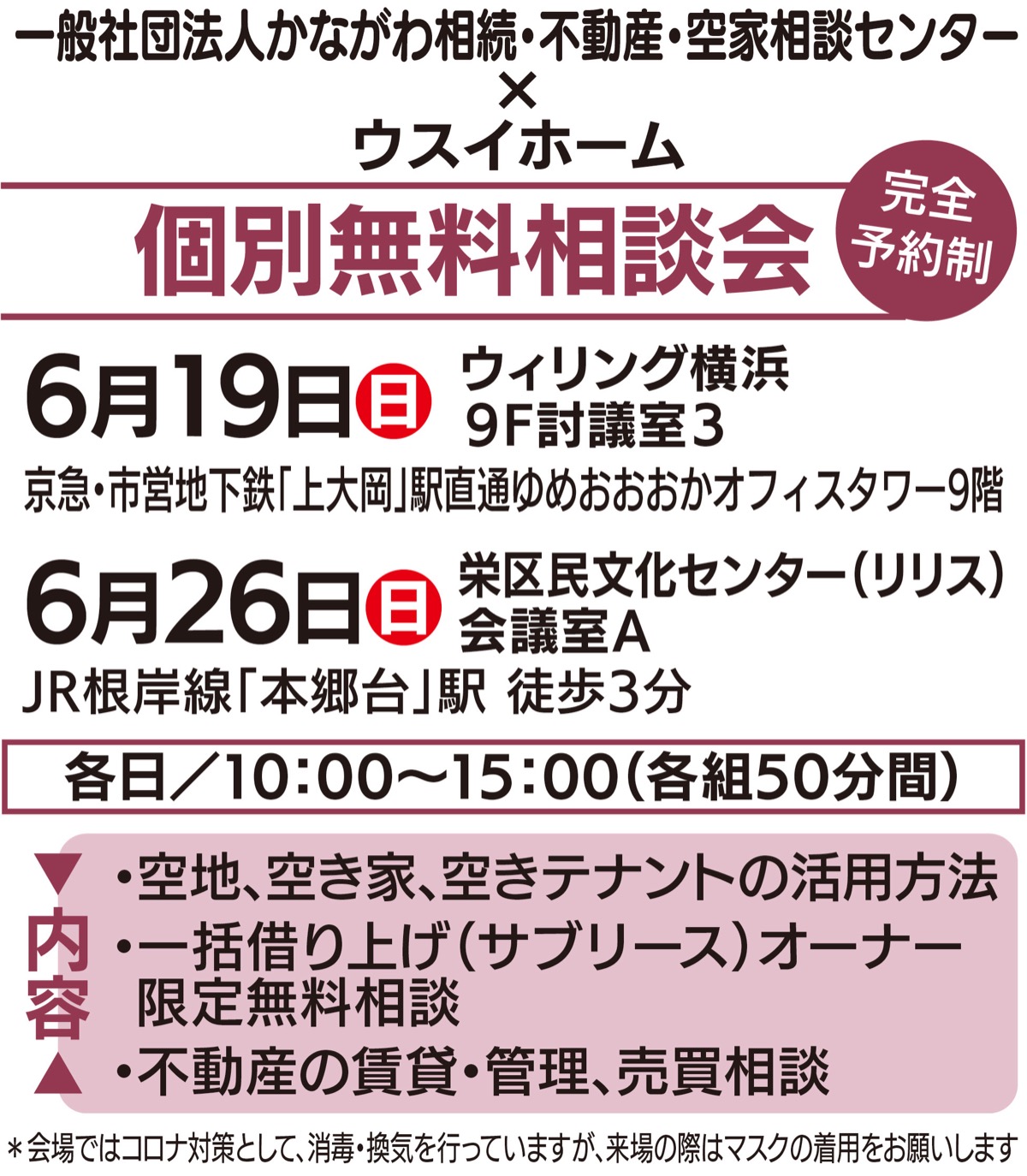 6月19日(日)にウィリング横浜(上大岡駅直通)、26日にリリス(本郷台駅3分)で開催される相談会は、横浜・横須賀・湘南を中心に県内で不動産事業を展開する(株)ウスイホームとの共催。多様な不動産の「悩み」に対応する。
