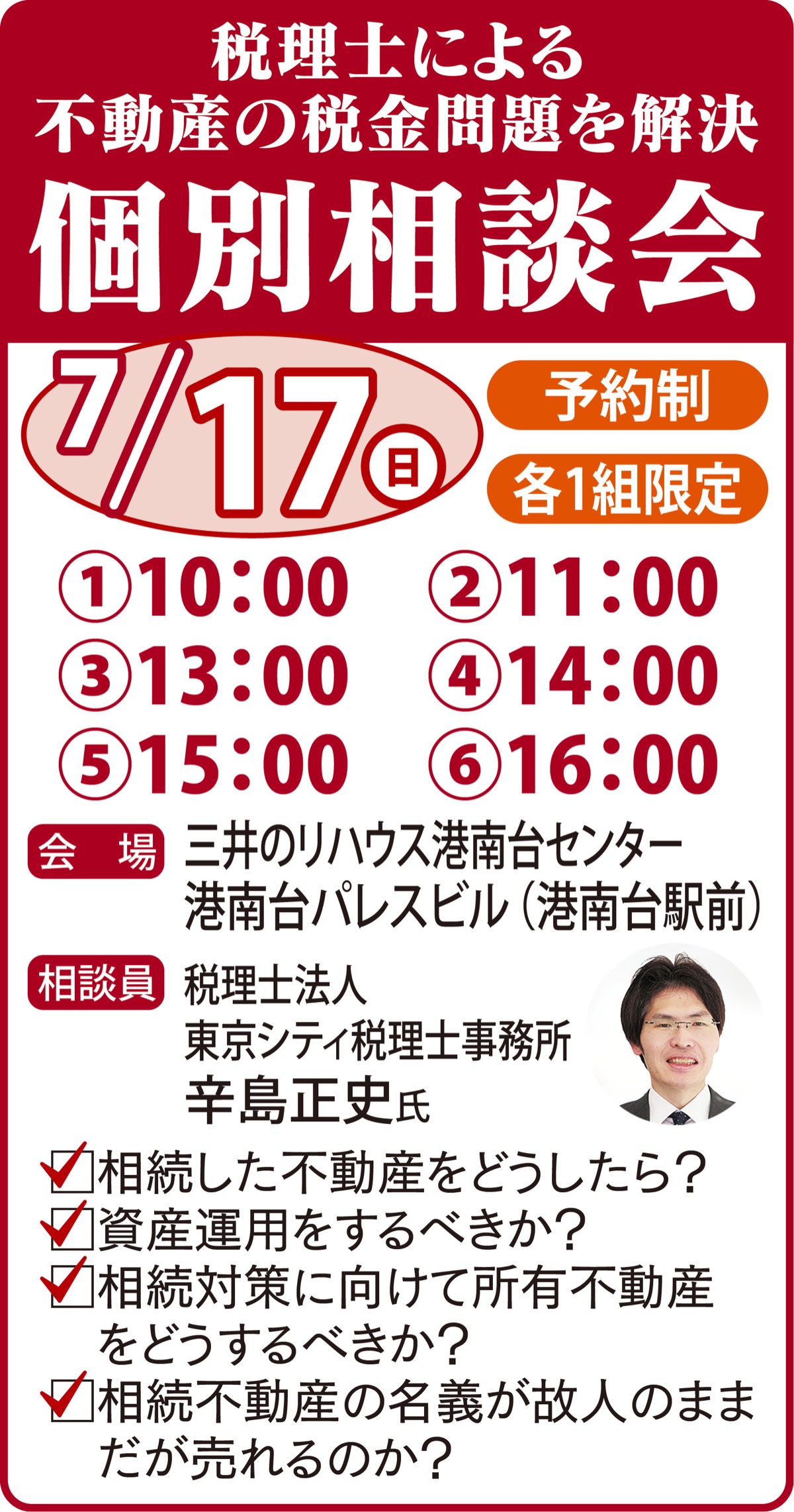 港南台パレスビル(港南台駅前)の三井のリハウス港南台センターで7月17日(日)、専門税理士を招いた個別の無料相談会を開催する。不動産・相続専門で39年の歴史がある税理士法人東京シティ税理士事務所の辛島正史氏を講師に招いての個別相談会。「相続」だけの税理士だけでは対応が難しい、「不動産相続」に特化した専門家ならではの知見で対応が可能だ。
