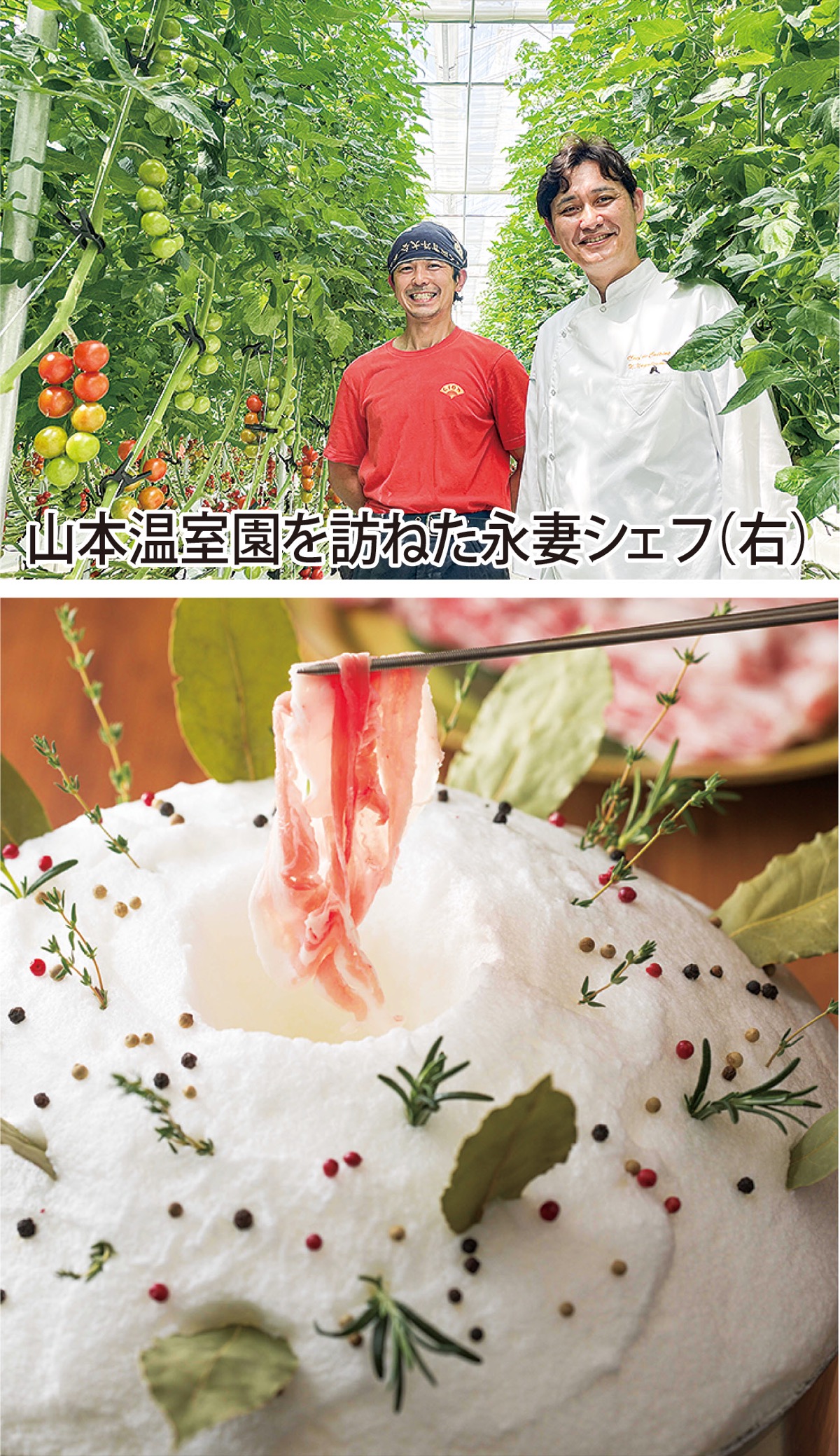 ブッフェスタイルでホテルグルメが満喫できる「カフェ トスカ」では、キッチンスタジアム 神奈川「地産地消」を開催中(7月12日(火)まで)。昨年シェフに就任した永妻氏が神奈川県産食材を使用した数々のメニューを考案。300年以上の歴史をもつ「山本温室園」の甘みが特長のミニトマトはカプレーゼで用意。あっさりとした脂と柔らかな赤肉の「湘南ポークオリーブプレミアム」はしゃぶしゃぶスタイルで(ディナーのみ)。この他、神奈川県産の季節野菜のバーニャカウダやポトフ、魚の旨味が凝縮した「神奈川県産地魚のアクアパッツァ」も登場。地元の恵みを楽しんで。