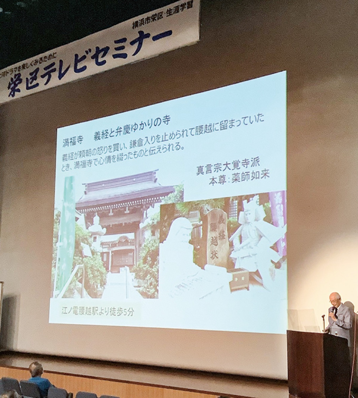 大河ドラマを楽しくみるために活動する栄区テレビセミナー(村田利昭委員長)は、放映中の『鎌倉殿の13人』を学ぶ講演「鎌倉殿と北条義時」を全5回で企画し、このほど最終回が地球市民かながわプラザホールで行われた=写真。
