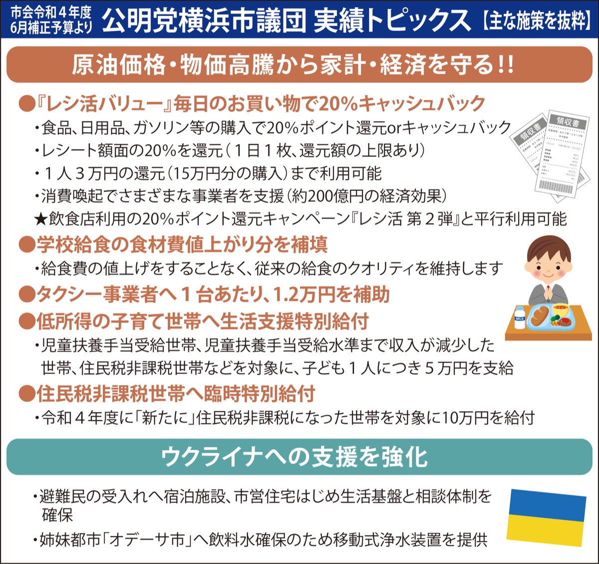 コロナ禍における物価・燃料費高騰対策の国会決議を受け、横浜市でも速やかに具体的な支援を多くの市民へ届けるため先月、市会臨時会を開催しました。公明党市議団としても臨時会に先立ち2度に渡り、生活困窮者支援・原油価格・物価高騰等の支援について、スピード感を持って対策するように市長へ要望していました。『新型コロナウイルス感染症対応地方創生臨時交付金』を市民生活に役立てるため、生活困窮世帯支援や幅広い市内事業者への支援、給食費補填などの各施策が決定していますので下表を参考に報告します。