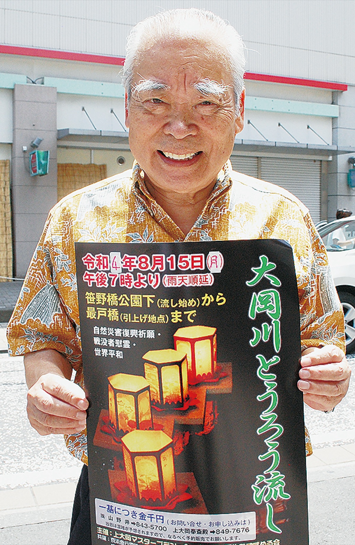 上大岡地区の「大岡川とうろう流し」が8月15日(月)、3年ぶりに開催される――。主催する上大岡マスタープランの会、大岡川の再生をすすめる会の山野井正郎会長は「基本的な感染対策を実施した上で、三密を避けて参加し、地域住民の皆さまに楽しんでもらえたら」と話している。