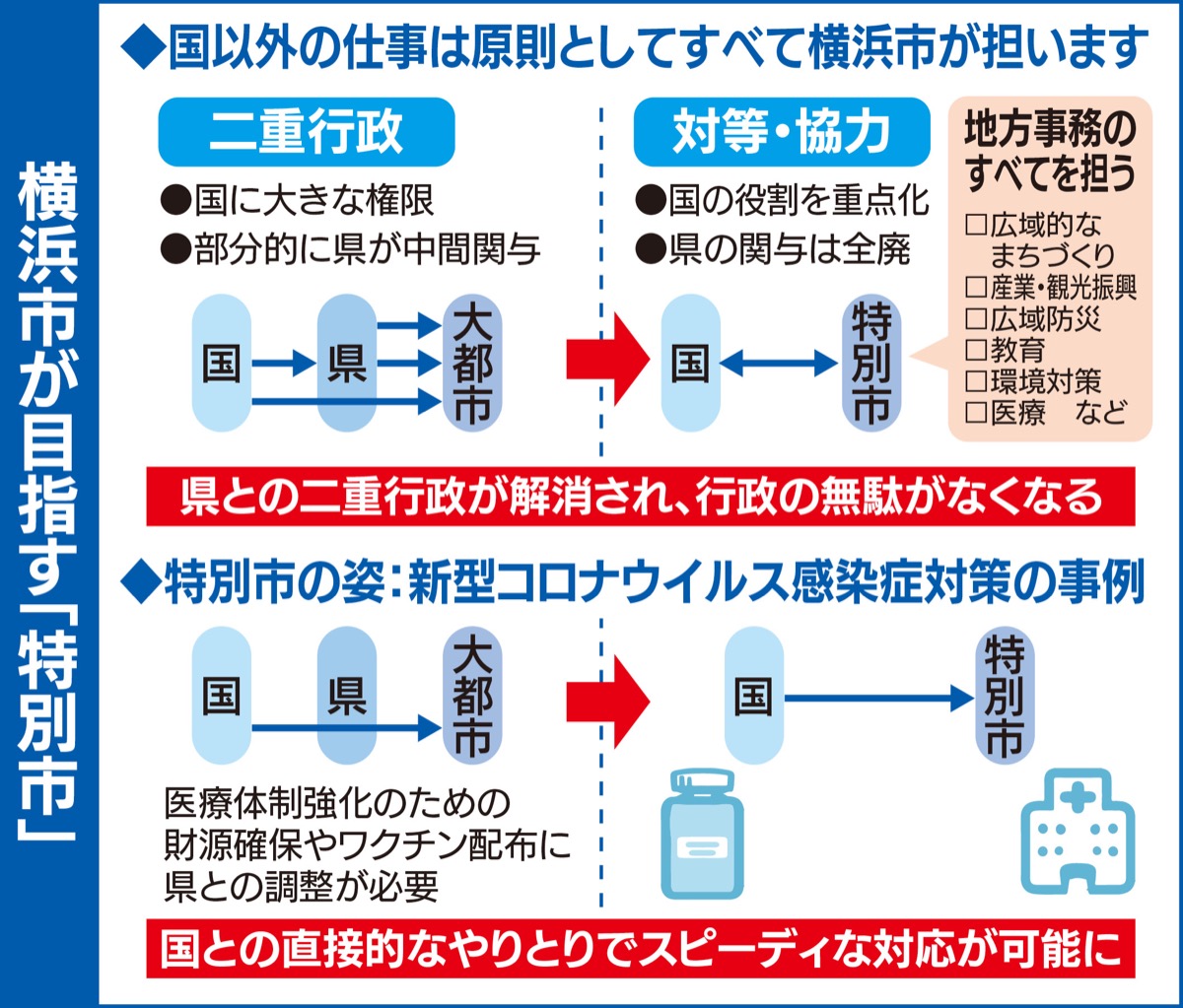 県と指定都市の間には「指定都市の市民は同じ県民税を払っているのに県から受けるサービスに較差がある」「崖地の災害対策やコロナ対応など一本化されずにどうすればよいか困る」など様々な問題があります。「国・県・大都市」の枠組みでは二重行政の無駄が多く、横浜市が目指す特別市であれば、「国・横浜市」が対等に協力し、国以外の仕事は原則として横浜市が担うことになるので、広域的なまちづくり、産業・観光振興、防災、医療、教育など地方事務のすべてをスピード感を持って進めることが可能になります。