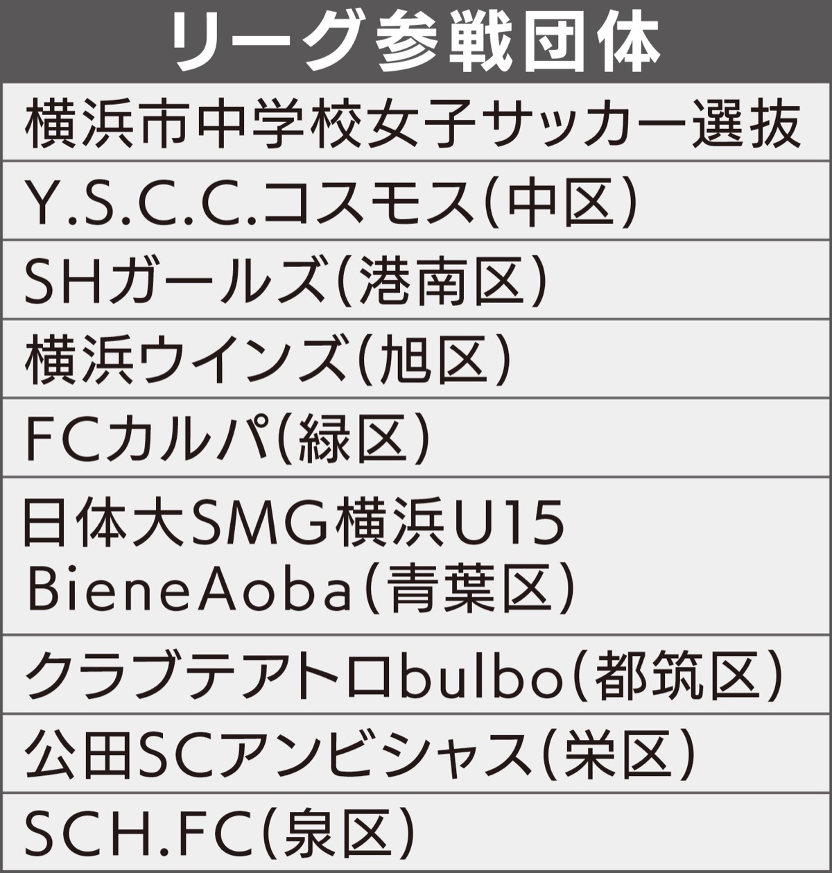 横浜市内で現在、女子中学生のサッカーリーグ「U-15ガールズリーグ」が行われている。女子選手にとって中学進学後にプレーを続ける場が少なく、競技離れが全国的に課題となる中、横浜サッカー協会が試合機会を作ろうと昨年新設。競技人口の底上げに取り組んでいる。