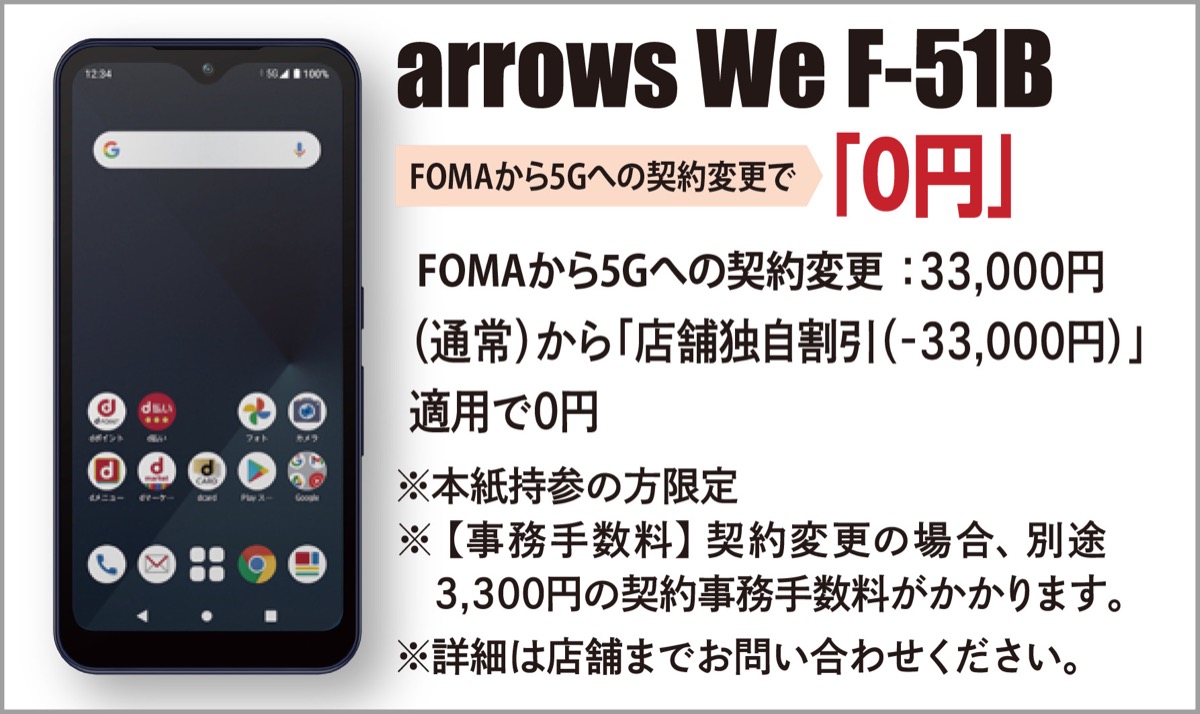 スマホの普及が進んでいる今、携帯電話各社では昨年より折りたたみケータイ(ガラケー)で使っている3G回線を順次終了中。これを受けドコモショップ上永谷店ではスマホへの切り替え相談を実施中。無料のスマホ教室も開催中。オンラインショッピングやLINEなどのコミュニケーションツールの使い方もわかりやすく教えてくれる。さらに本紙を持参すると人気のスマホ「arrowsWe F-51B」が0円になるお得なチャンス。