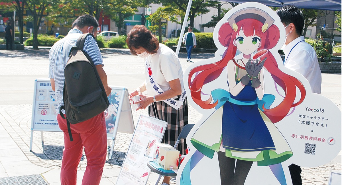 神奈川県共同募金会 栄区支会が主催する赤い羽根共同募金活動が10月1日に開始され、本郷台駅前でキャンペーンが行われた。民生委員らが募金を呼び掛けたほか、市内18区の魅力を発信するプロジェクト「Yocco18」のキャラクターとのコラボ企画として、等身大パネルの展示も行われた。集まった募金は栄区のボランティア団体等に分配され、区内の地域福祉に役立てられる。