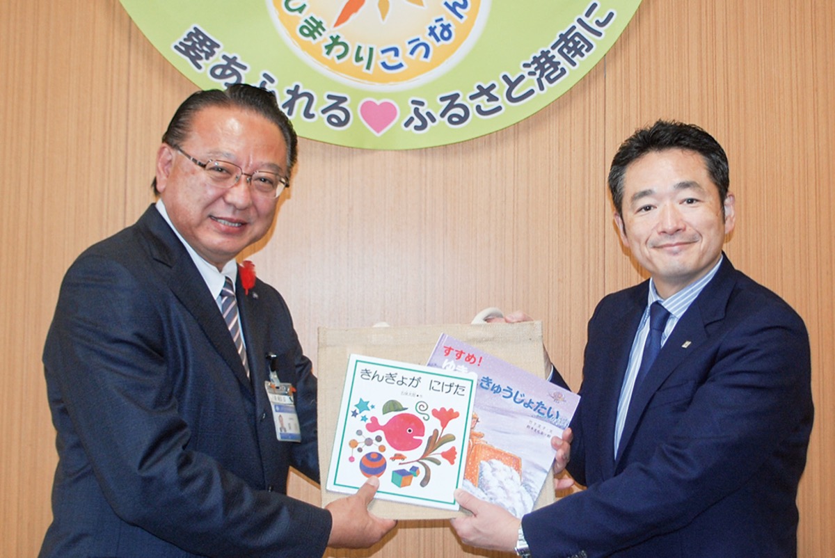上大岡駅直結の京急百貨店(竹谷英樹社長)が10月6日、港南区役所に絵本とエコバッグを寄贈した。1日に開店26周年を迎えた同社の記念企画「地球をえがおに サステナブル ライフスタイルフェア」の一環。