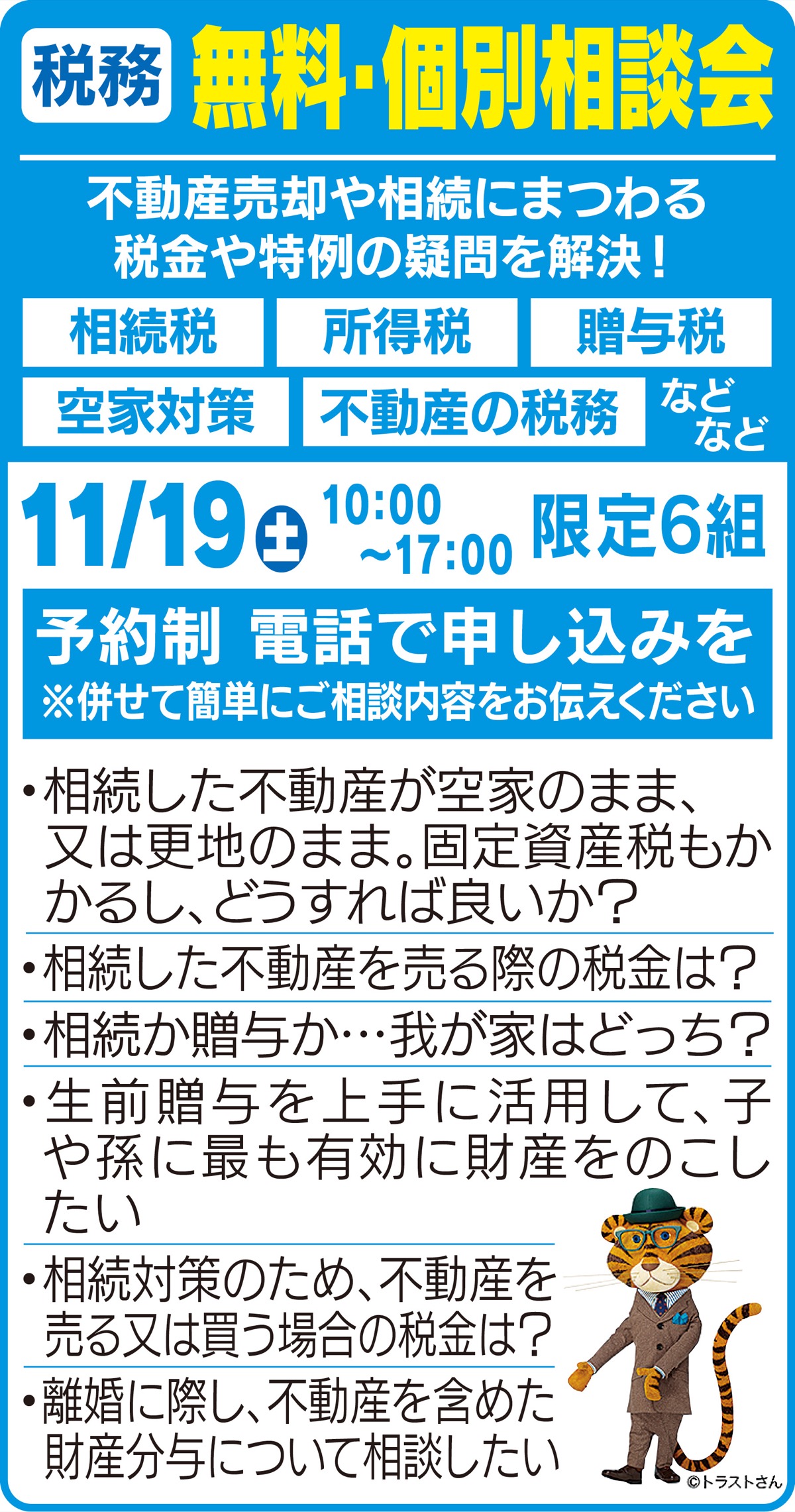 相続税や贈与税、有効活用、購入・売却・住み替えなど不動産に関するお悩みや疑問について、相続や不動産を専門とする同社の提携税理士に相談できる貴重な機会だ。「我が家に相続税はかかるの?」「不動産の売却や住み替えにまつわる税金や特例について知りたい」「相続した不動産はどうすればいい?」「節税案を知りたい」など1組60分、我が家の場合での相談が可能。限定6組で予約制(先着順受付)。申込みは下記【フリーダイヤル】で。