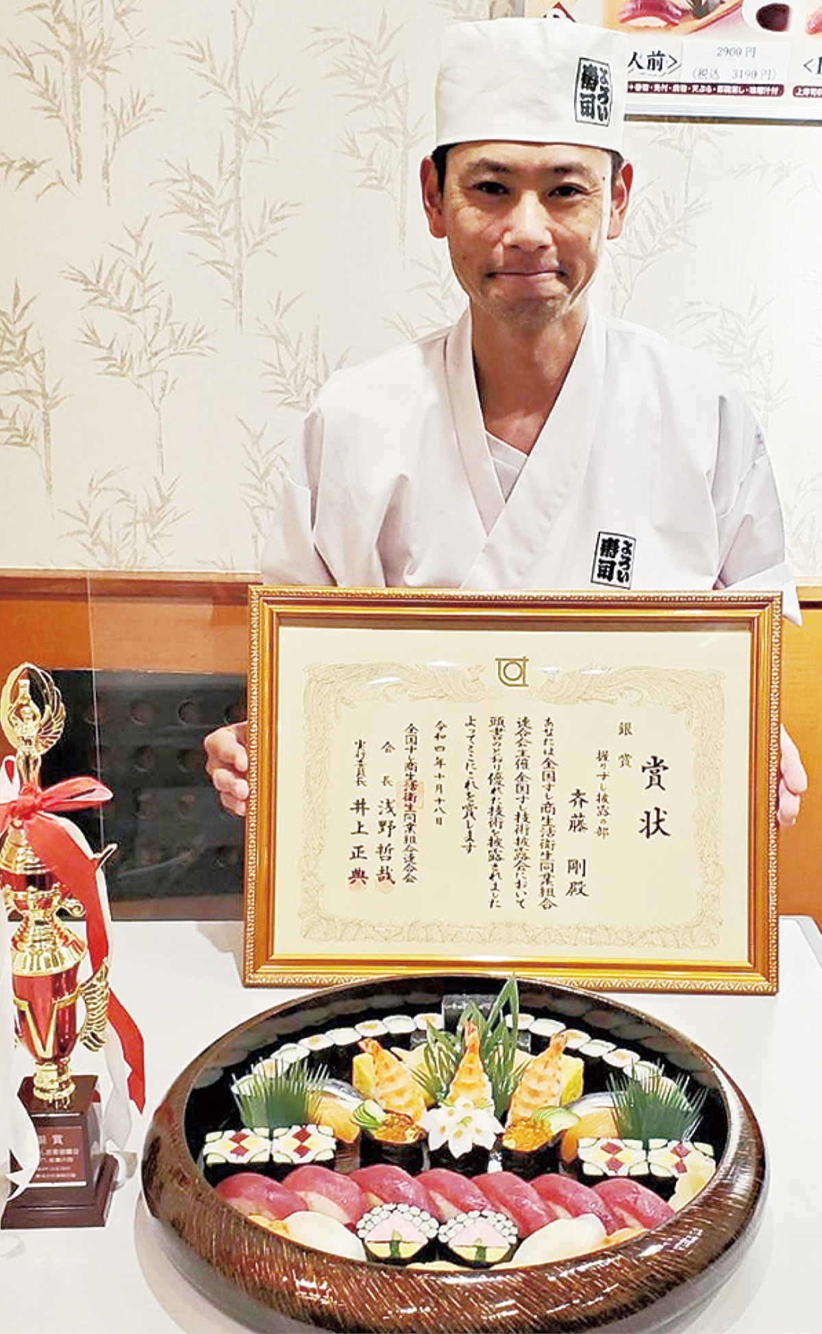 寿司の伝統技術の保存と向上を目的に行われる「全国すし技術披露会」(全国すし商生活衛生同業組合連合会主催)がこのほど新宿の京王プラザホテルで実施された。栄区小菅ケ谷の「よろい寿司本郷台本店」の齊藤剛さんが、初出場ながら「握りずし披露」の部で見事銀賞に輝いた。