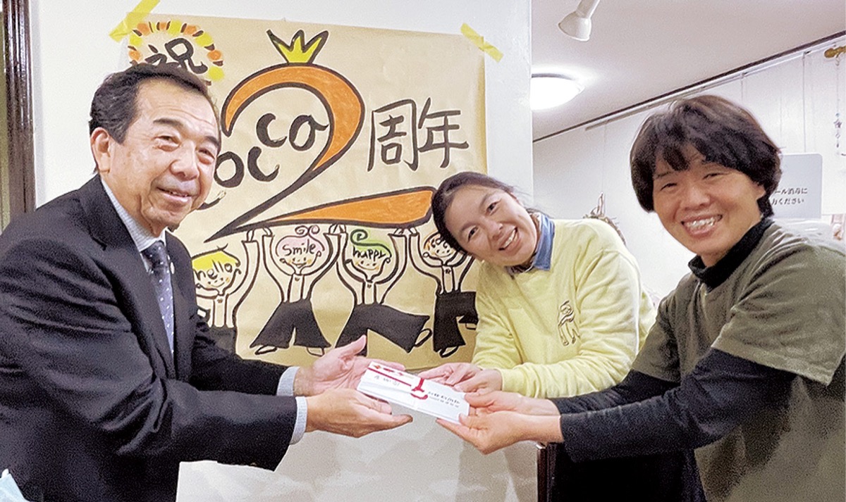 日野南でコミュニティカフェを運営するicoccaひのみなみにこのほど、同社の辻政彦専務が目録を贈呈。同NPO法人の池田邦子さんと鳥海知恵子さんは感謝を述べた上で「カフェ内のフリースペースの整備に使用する予定で、これからも『誰もひとりぼっちにしない街』を理念にicoccaをまちの皆さんと一緒に作り続けます。遊びにきてください」と話す。