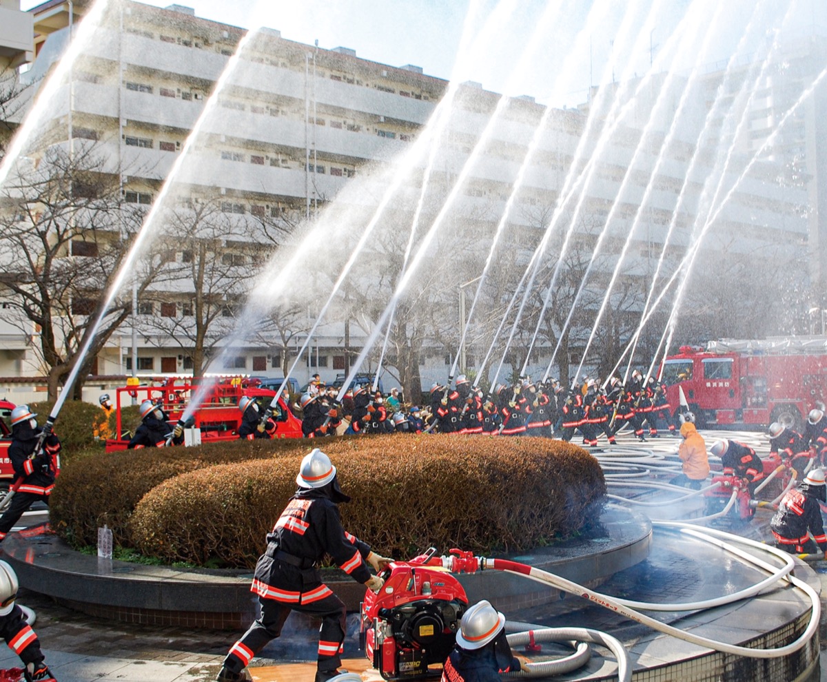 第一部では関係者のみで式典を実施し、防火功労者や消防団員の永年勤続表彰などが行われた。第二部では同所アプローチデッキ周辺で、栄区内を中心に活動するグループ「昇龍」が力強い和太鼓演奏を披露。続いて栄消防団らが一斉放水を実施した。