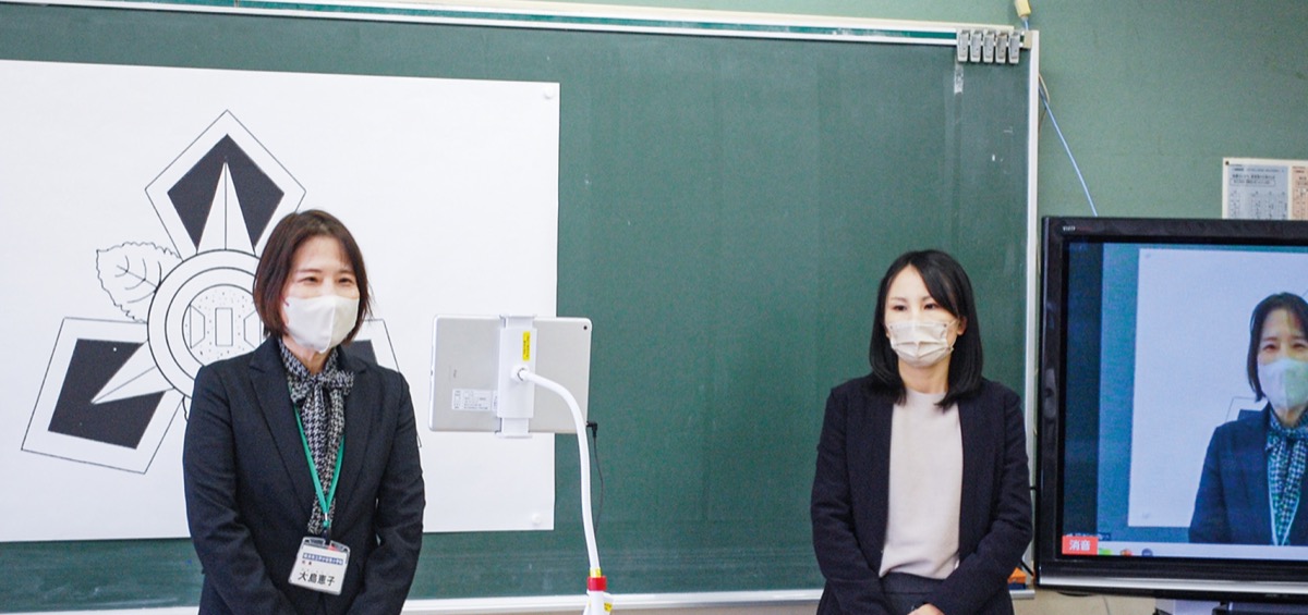 午後の部では、密を避けるためオンラインで各教室と会場をつなぎ、創立記念式を実施。来賓らの挨拶に続き映像による学校の歴史の振り返りや、午前中の発表の様子を写した動画が放映された後、最後に校歌斉唱で締めくくられた。