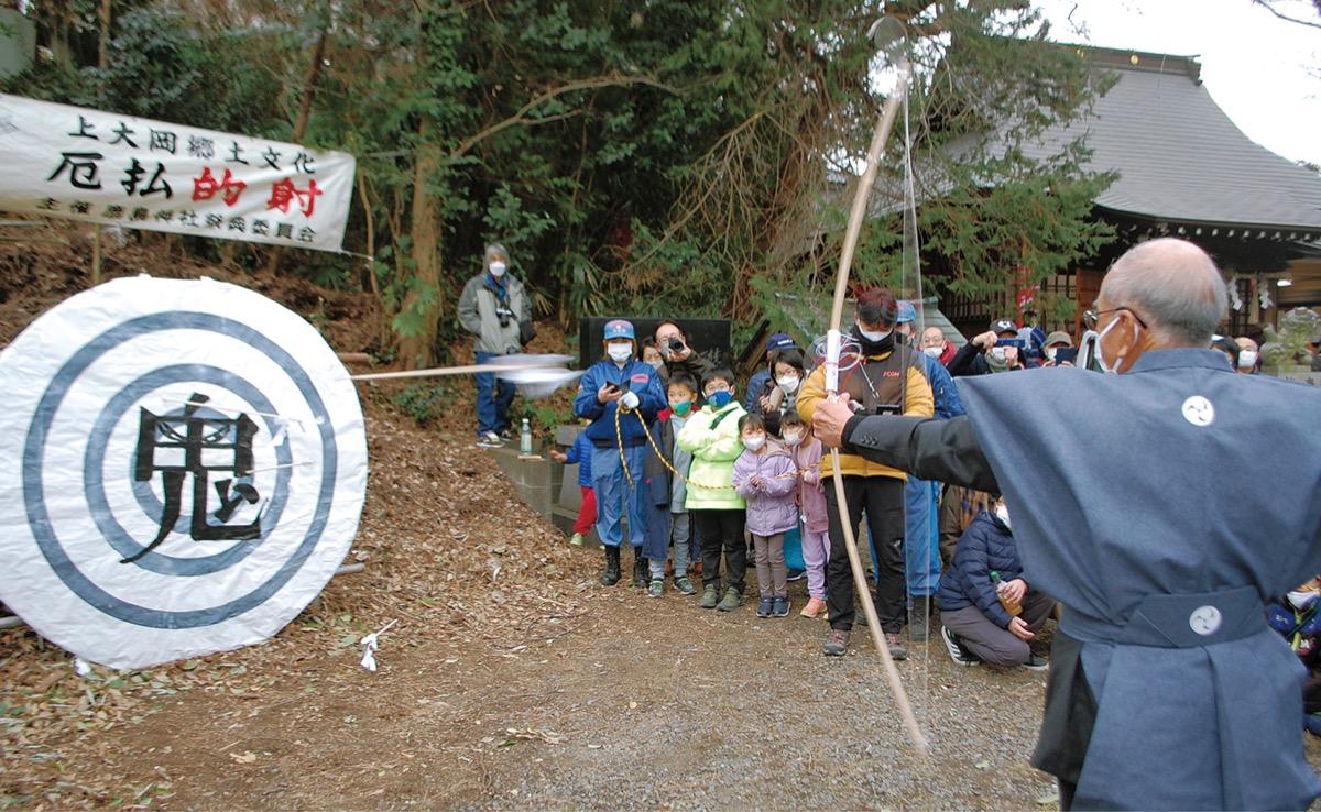 的が境内に着いた後は、地域住民のほか上大岡小学校の児童らが次々と矢を放ち、見事命中すると周囲からは大きな歓声と拍手が巻き起こった。その後、矢が刺さった的は厄払いの願いを込めて火がつけられ、訪れた人たちは炎を見ながら一年の無病息災を静かに祈っていた。続いて、世話人らによる節分の豆まきが行われ、行事は締めくくられた。