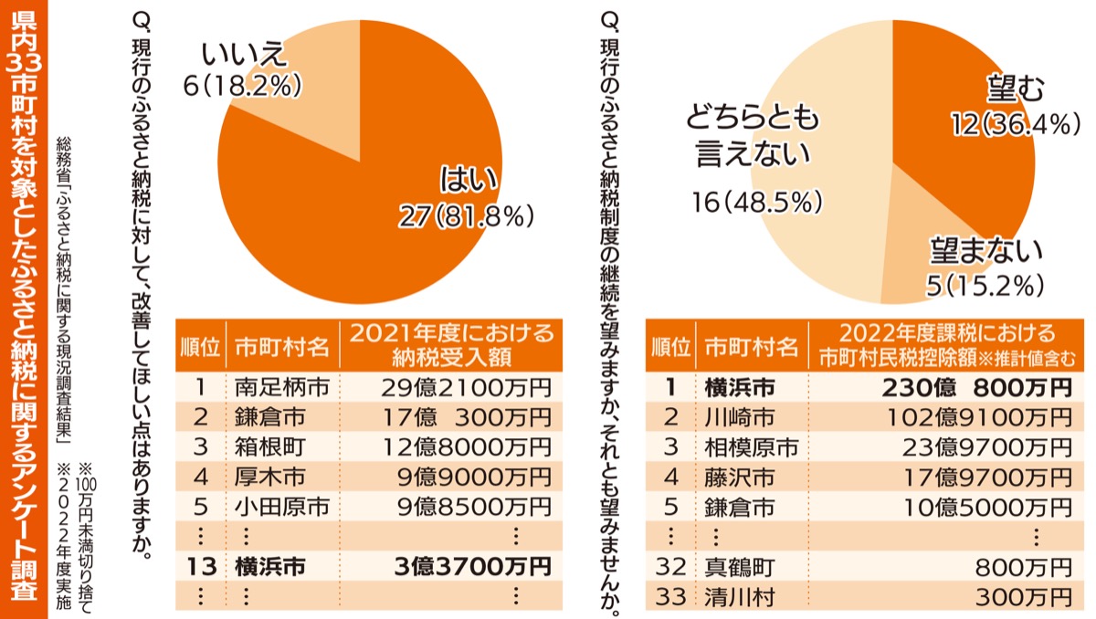 タウンニュース社は「ふるさと納税」に関する神奈川県内の自治体の受け止めなどを探るアンケート調査を実施した。その結果、現行のふるさと納税制度について、県内33市町村のうち8割を超える自治体で何らかの改善を希望していることなどが明らかになった。アンケートは昨年12月に県内33自治体を対象にしたもので、すべての自治体から回答があった。