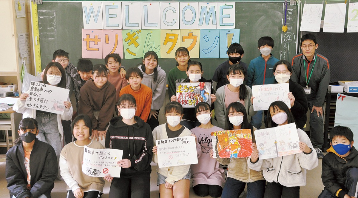 2月27日、せりぎんタウンで6年2組児童がポスター掲示活動を実施。「自転車は降りて通ろう」「走るな危険!事故るぞ」などのメッセージに合わせ作成した交通安全ポスターを各所に貼っていった。また、「WELCOME to せりぎんタウン!」とカラフルな標語も掲示板に貼り付けた。