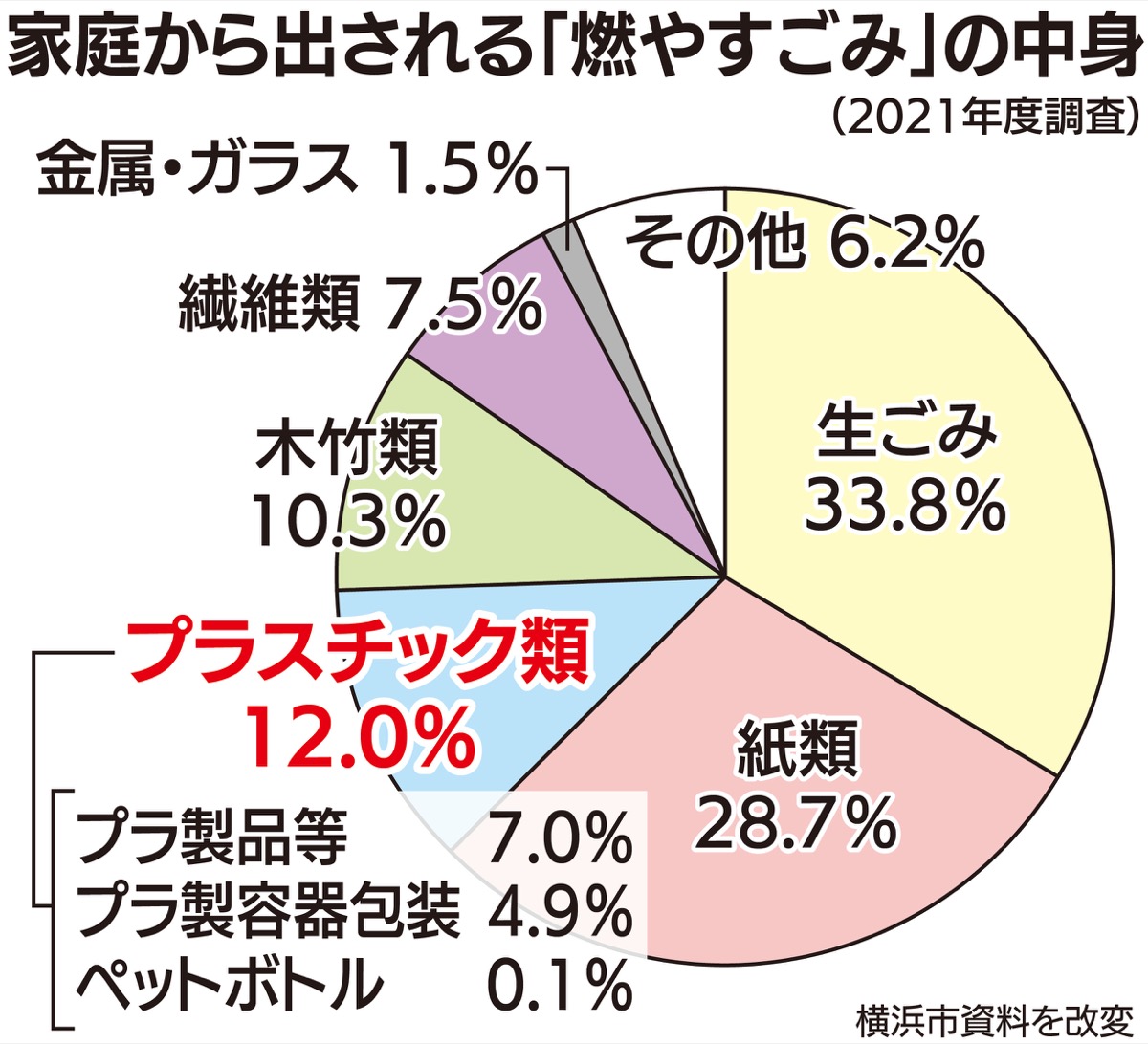 一方、バケツや歯ブラシ、ハンガーなどプラでできた製品は、生ごみと同じ「燃やすごみ」の扱いだ。市の21年度調査では、燃やすごみの中に分別対象ではないプラ製品等が7%含まれていた。一般的な算定だと1kgのプラごみを燃やすと、2・77kgの二酸化炭素が発生するとされ、焼却されるプラ製品等の分別とリサイクルが脱炭素社会に向けた大きな課題だ。