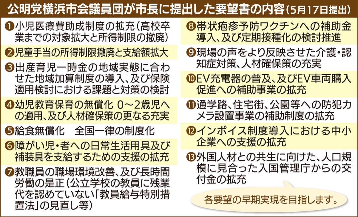 そこで、5月17日、公明党横浜市会議員団として、横浜市民の声をカタチにするために本市行政の取り組みはもとより、国からの支援なしに実現が難しい項目につき、本市より国へ強く求めて頂くよう、下記13項目の要望を市長へ提出しました=写真。市民生活をいまより良い状態にするのが我々の責務です。スピード感を持って各種要望をカタチに邁進します。