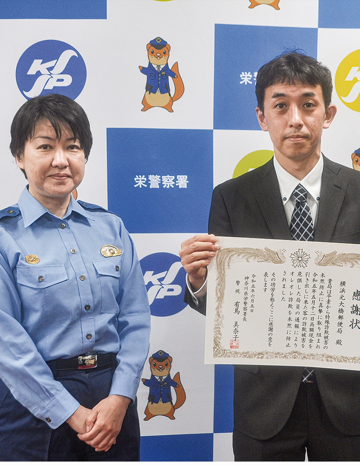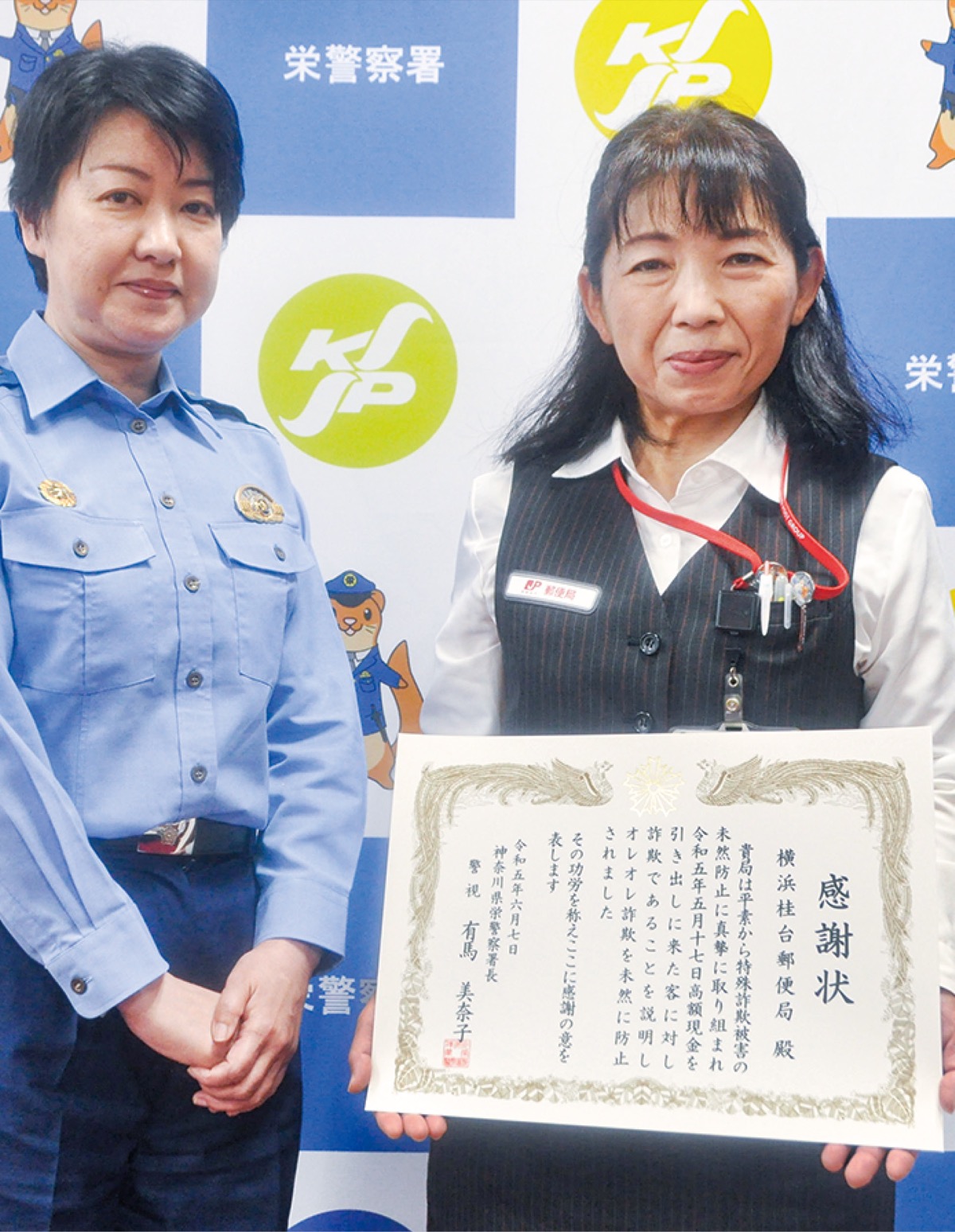 栄警察署(有馬美奈子署長)管内にある2カ所の郵便局でこのほど、局員が積極的な声掛けを行うなどし、特殊詐欺被害を防止した。同署は6月上旬に防止した各局員らへ感謝状を贈呈した。