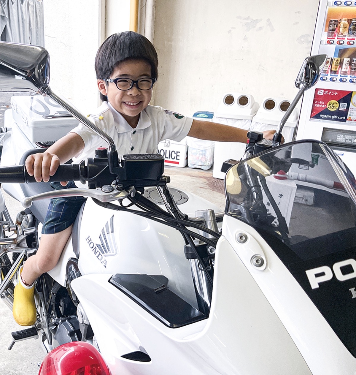 当日、港南警察署を訪れた年長園児7人は白バイとアクティブ交番への体験乗車をした後、警察官へ花束を渡し、記念撮影を行った=写真。