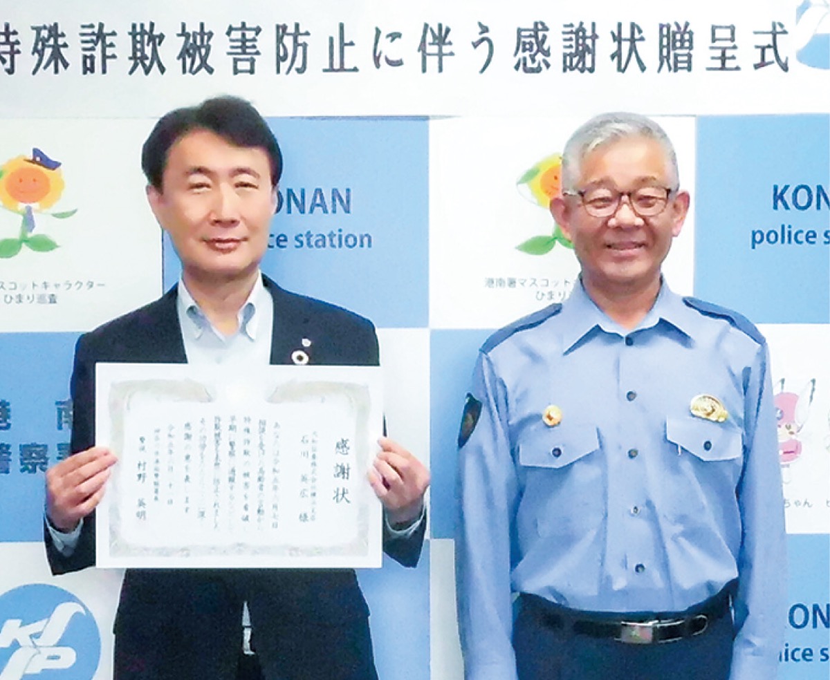 大和証券(株)横浜支店の石川英広主事が特殊詐欺被害を防止したとして、港南警察署(村野英明署長)はこのほど、その功労に対し署長室で石川さんに感謝状を贈呈した。