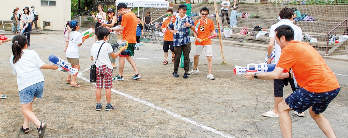 港南区の吉原小学校で15日、水鉄砲大会が行われた。主催は吉原小おやじの会。