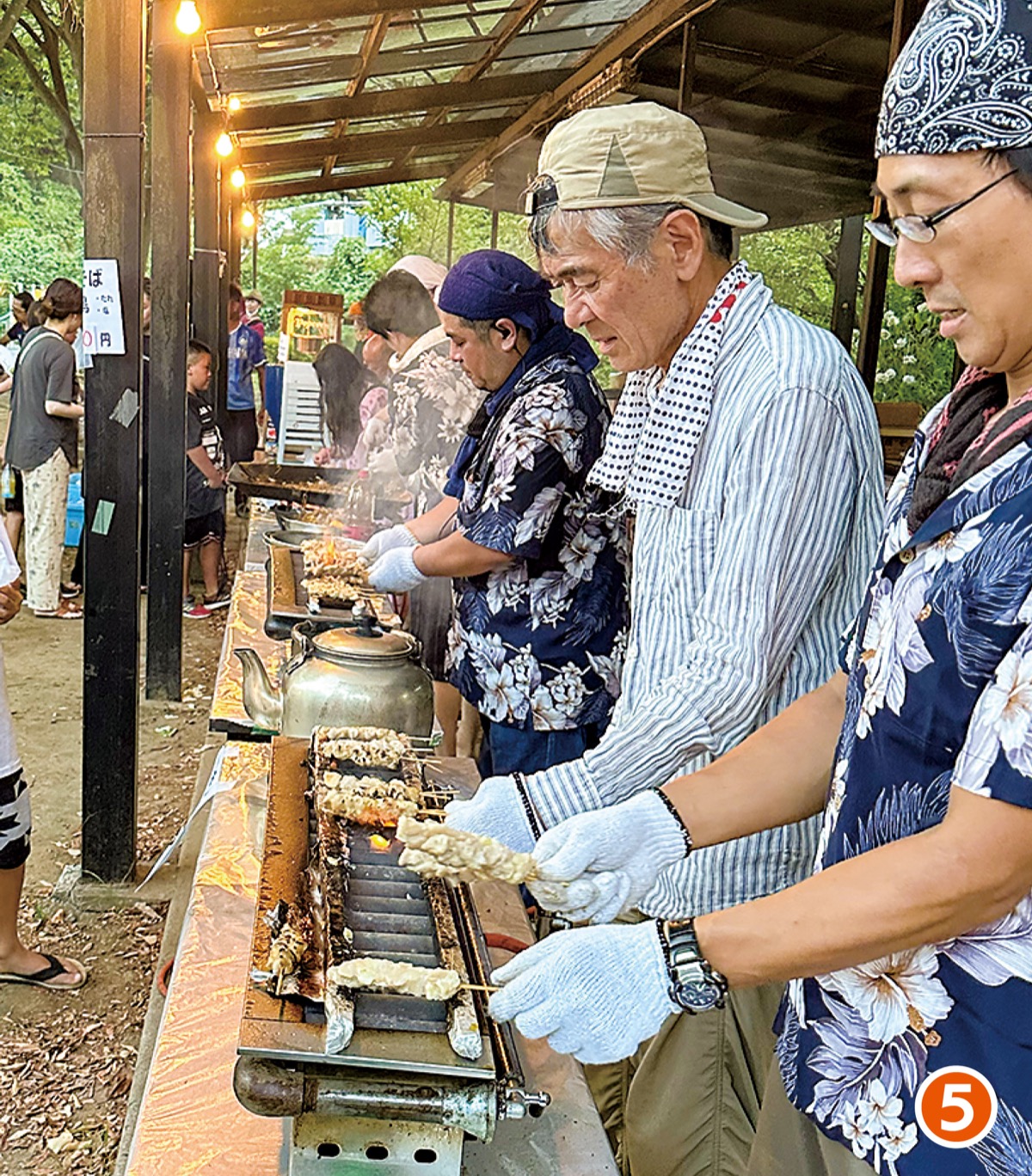 例年は1000人以上が集まるという祭りには焼き鳥やポップコーンなどの出店=【5】=が並び、会場には長蛇の列ができていた。