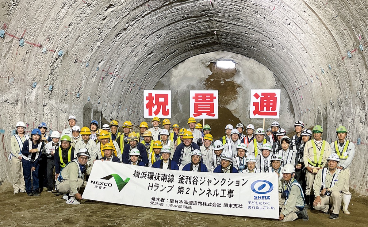 栄区内の公田町や田谷町などで東日本高速道路(ネクスコ東日本)が整備を進める、高速横浜環状南線(釜利谷JCT〜戸塚IC※仮称)と横浜横須賀道路を接続する「釜利谷JCT Hランプ第二トンネル」。1日、実貫通し、同トンネル内で式典が行われた。