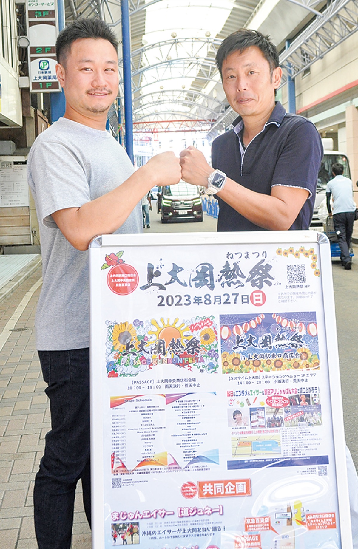 そこで東口商店会の新会長に就任した石塚丈雅さん(51)へ金子理事が声をかけ「上大岡熱祭」という同じ冠を掲げ同日にイベントを実施することが決まった。年齢も近いことから旧知の間柄で、共に地元出身で桜岡小学校の卒業生ということもあり上大岡の活性化のために意気投合した。