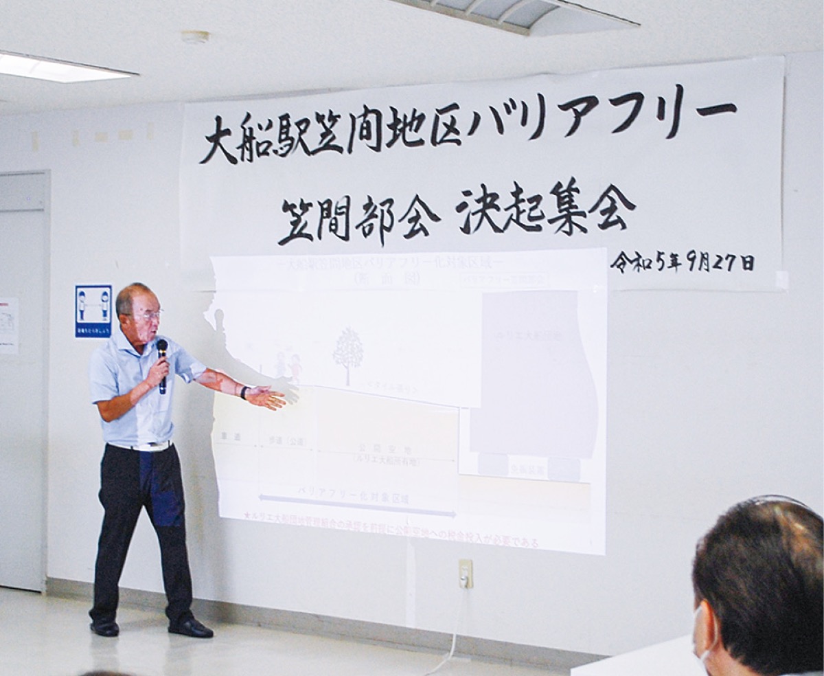 笠間連合町内会自治会の役員らが中心となり、大船駅笠間口周辺のバリアフリー化を目指す「大船駅周辺笠間地区バリアフリー検討笠間部会」の決起集会が9月27日に開かれ、決起集会宣言が採択された。