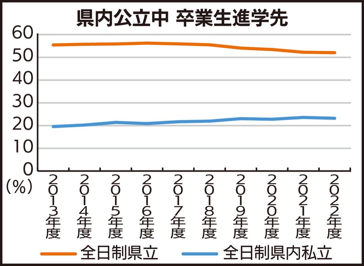 2022年度は6万8002人が県内の公立中学校などを卒業し、そのうち約22%にあたる1万5050人が県内の全日制私立高校に進学した。13年度の約19%(7万0571人中、1万3479人)と比較すると、県内私立高校への進学率は上昇傾向にある。