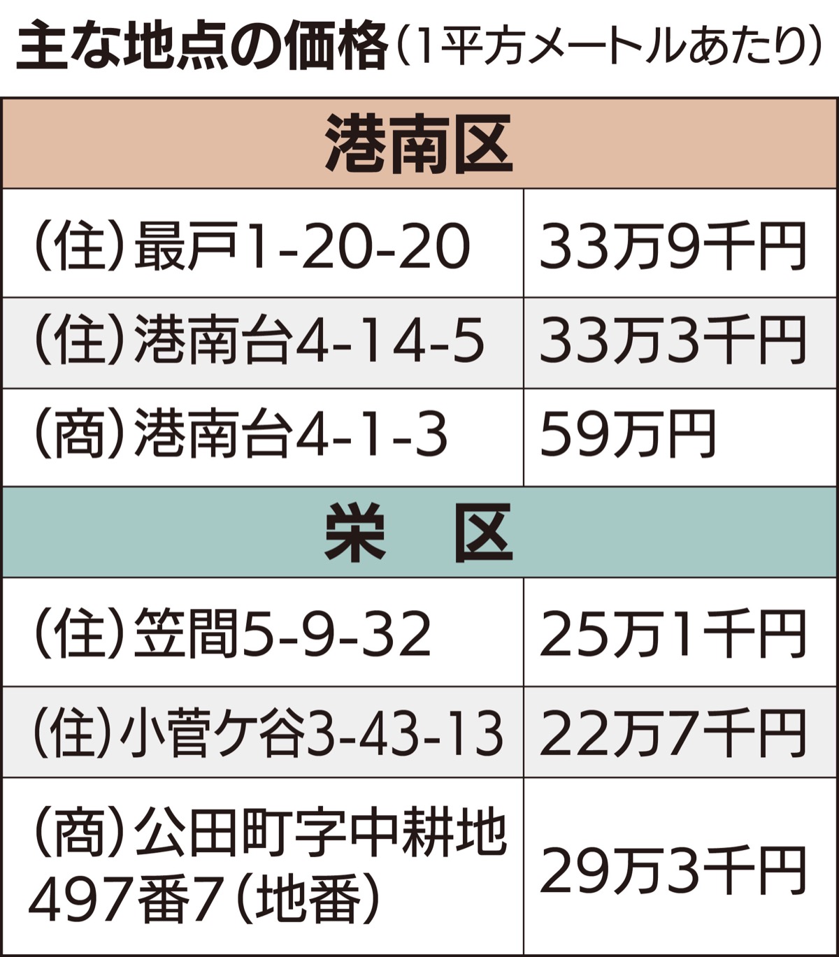 県が発表した港南区の住宅地の中で最も高ったのは、上大岡駅近くの「最戸1の20の20」で1平方メートル当たり、33万9千円。商業地で最も高ったのは港南台駅近くの「港南台4の1の3」で59万円だった。また、栄区の住宅地では「栄区笠間5の9の32」の25万千円が最も高く、商業地では「公田町字中耕地497番7(地番)」が29万3千円でより高くなった。港南区の住宅地の平均は約20万円(100の位以下四捨五入)、商業地の平均は約37万5千円(同)、栄区の住宅地平均は18万4千円、商業地平均は約26万6千円(同)だった。昨年比変動率の平均は港南区の住宅地で約2・1%上昇。栄区の住宅地で約1・7%の上昇となっており、地価が上がっていることがわかった。昨年も一昨年比、港南区で約0・7%、栄区で約0・9%の微増となっており、上昇が継続した。