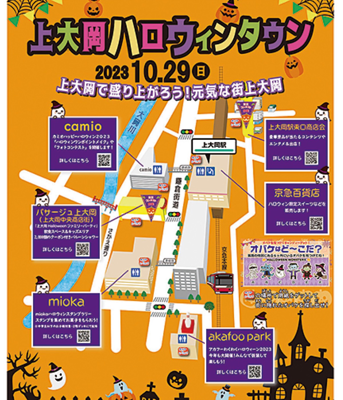 上大岡駅東口商店会では豪華賞品が当たる企画や飲食等の出店を予定。上大岡中央商店街(パサージュ上大岡)ではキッチンカーやキッズファッションショーを企画。また、京急百貨店ではハロウィーン限定スイーツの販売も予定されている。各会場の「オバケ」を6体全部見つけるとギフトカードが当たる企画に参加できる。